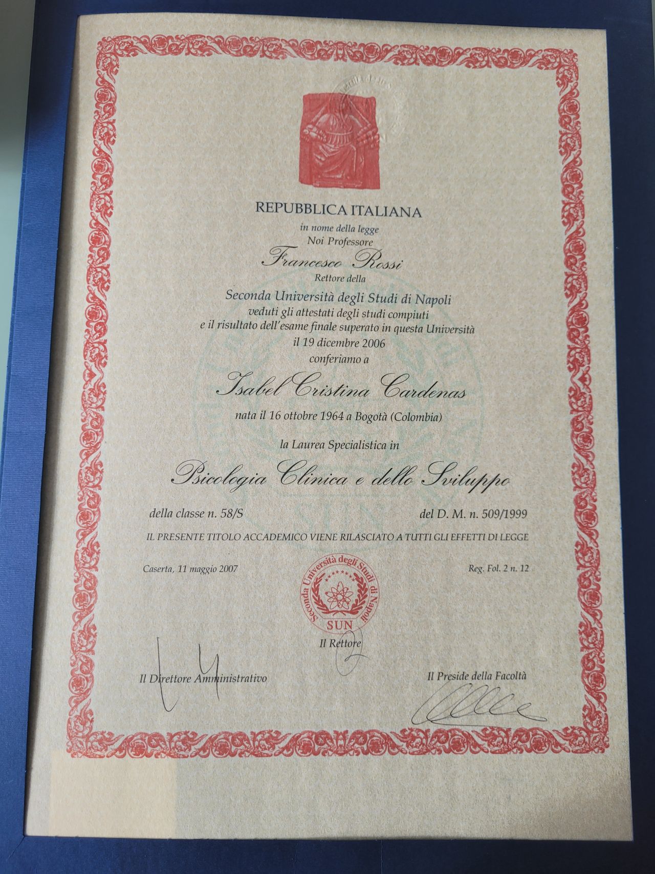 Soy Psicoterapeuta, ex docente universitaria y doctor magistral en Psicología Clínica y del Desarrollo. He llevado a cabo mis estudios y experiencia laboral en Colombia y en Italia y mi objetivo es que muchas personas puedan recibir terapia psicológica de calidad en su propio idioma, sin importar el sitio donde vivan.